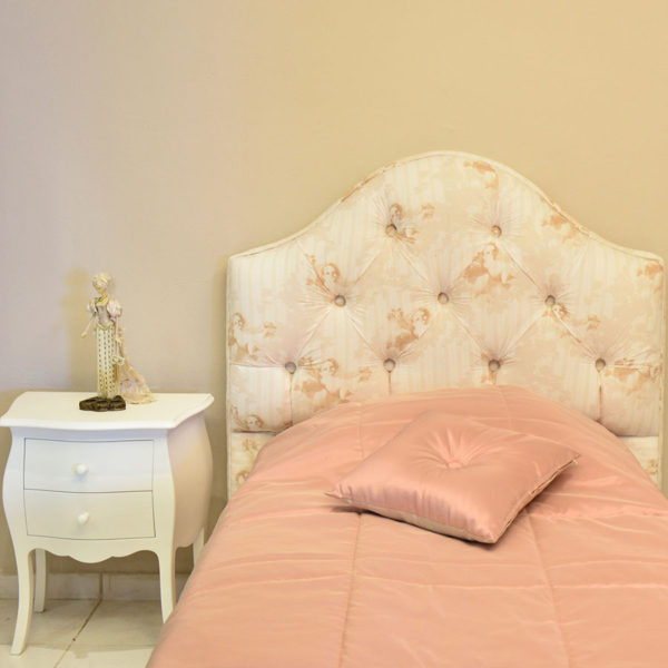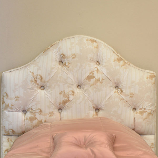 Παιδικό κρεβάτι Angels. Χειροποίητο κρεβάτι από ξύλο καρυδιάς με ψηλό υφασμάτινο κεφαλάρι του οίκου Volpi άριστης ποιότητας.