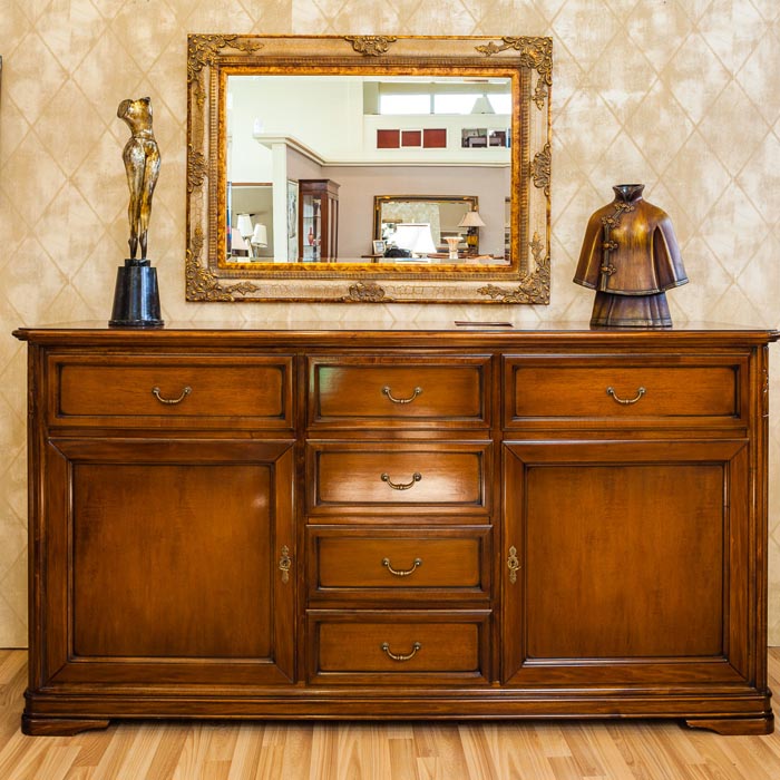 Μπουφές σαλονιού Ektor τρίφυλλος από μασίφ ξύλο καρυδιάς με χειροποίητο ειδικό λούστρο, ιδιαίτερο σχέδιο και έξι συρτάρια. Δυνατότητα επιλογής ξύλου και αποχρώσεων λούστρου ή πατίνας.