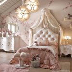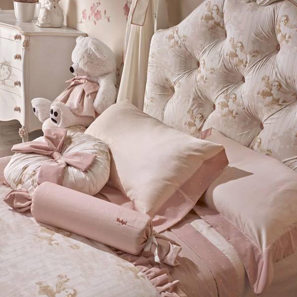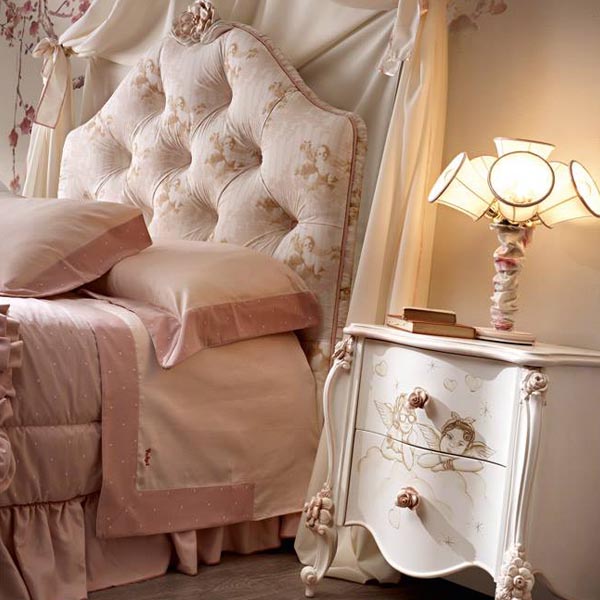 Ρομαντικό παιδικό κρεβάτι Carmen από ξύλο καρυδιάς με ξυλογλυπτες λεπτομέρειες ζωγραφισμένες στο χέρι του οίκου Volpi.