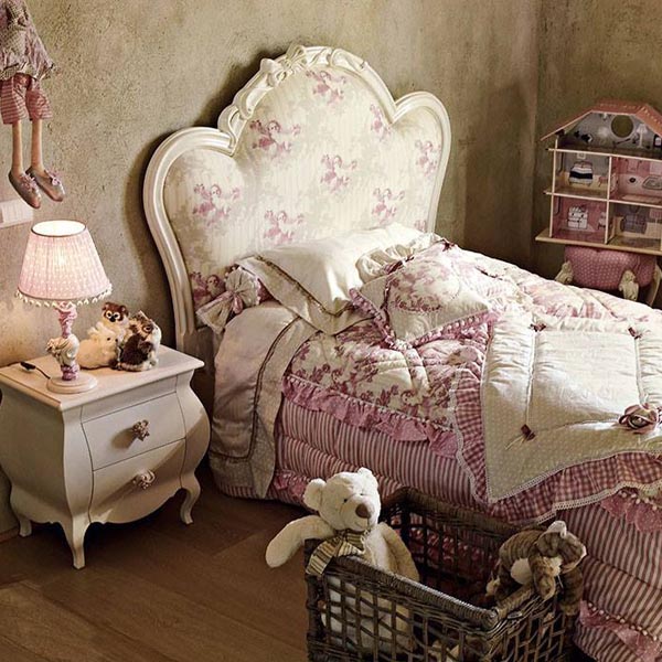 Παιδικό κρεβάτι με λευκή πατίνα Serena. Κρεβάτι του οίκουVolpi από ξύλο καρυδιάς με χειροποίητα σκαλίσματα και άριστης ποιότητας υφάσματα.